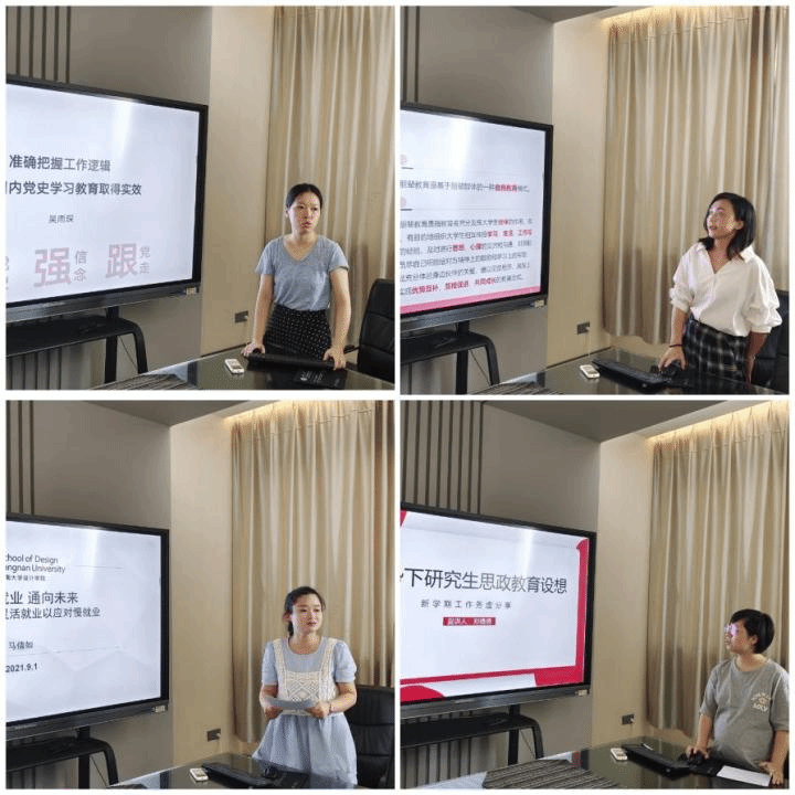 吴雨琛以“准确把握工作逻辑,推动团内党史学习教育取得实效”为题,探讨成人网站共青团工作开展的方法。她认为,学党史要与育人有机结合,要依托团的组织体系优势和动员能力,以组织化学习为基本方式,以团支部为基本单元,严格落实“三会两制一课”制度,推动学习教育接地气、聚人气。曹淑慧挖掘朋辈教育的意义,重点阐述了朋辈教育在大学生思想政治教育合力系统中的重要性。她指出,朋辈教育应涵盖多层次的价值导向,通过构建成人网站、班级、校友朋辈榜样教育助力大学生在不同学习阶段的成长。郑倩倩聚焦新形势下研究生思政教育,她认为,辅导员在日常管理服务中挖掘思想政治教育元素,实现管理和思政教育两者融合式发展,将有助于提高研究生思政教育的成效。她分析了目前研究生思政教育的难点,并从入学教育、干部选拔、奖助评定、心理健康四个方面提出新形势下研究生思政教育的设想。马倩如聚焦当前设计学生“慢就业”的现象,分析了当下毕业生慢就业的原因,梳理了灵活就业的优势与劣势、从事灵活就业的必要条件并结合数据和案例讲解,提出了新形势背景下就业工作的新观点,新思路。