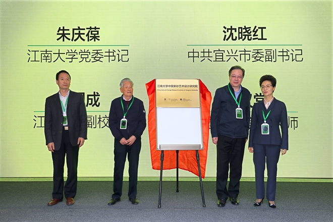 中国紫砂艺术设计研究院揭牌和作品展开幕表示祝贺;他指出,大学是文化艺术传承与创新的高地,是“让非遗进入生活、弘扬中华优秀传统文化”的主阵地,希望研究院的成立,能够为保护、传承与创新紫砂工艺和振兴地域经济的重要平台,为学校高水平人才培养和传统文化传承传播做出积极贡献;希望此次展览成为学校美育教育的良好课堂,以美为媒,把美术成果更好服务于人民群众的高品质生活需求。