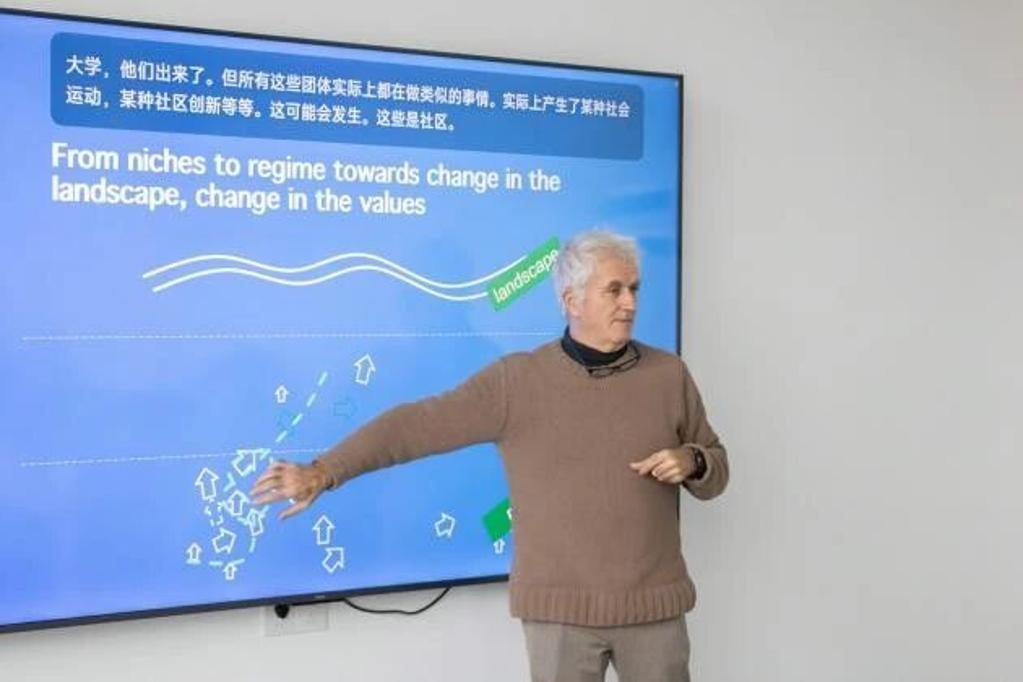 Nicola Moreli教授开展了题为"通过操控城市景观的社会、文化及实践要素设计系统性变革--系统性创新的原型构建、设计方案与规模推广实例与思考"的讲座。讲座由副院长周林主持,院长助理钱晓波、专业课教师肖东娟、时迪、董玉妹等共同参与。