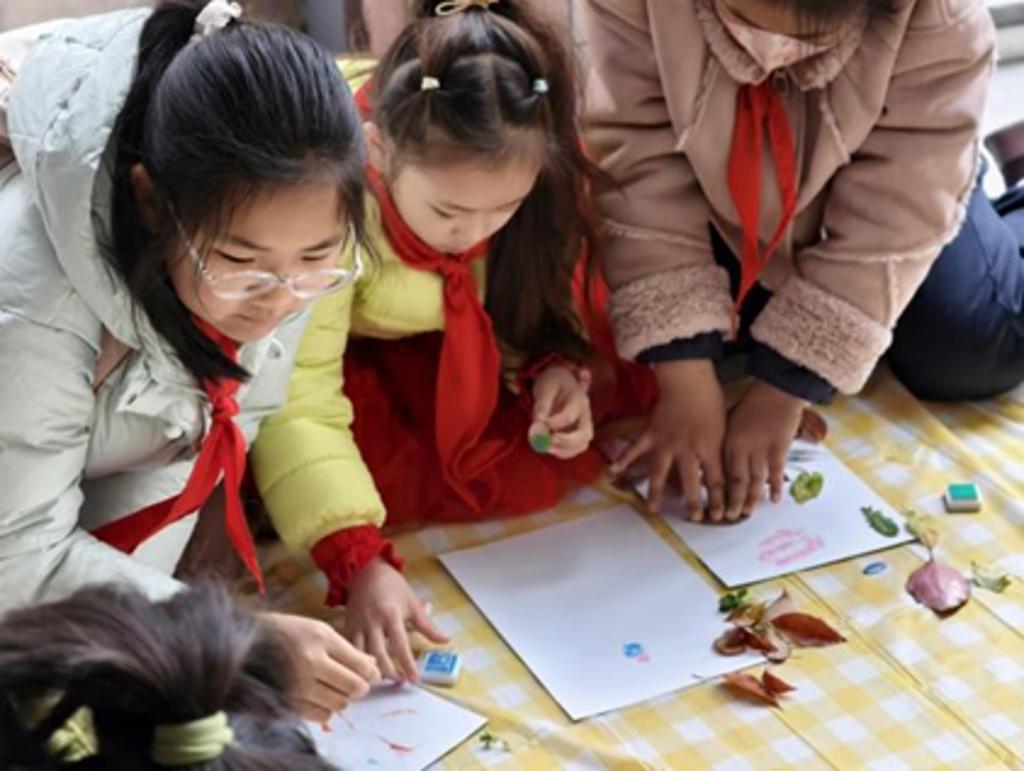 实践环节以“自然公益”为主题展开落叶创意创作。在教师的引导下,队员们收集校园内形态各异的落叶,践行“变废为宝”的可持续理念。孩子们化身“小小设计师”,精心构思、巧妙拼贴,将寻常落叶转化为一幅幅充满童真与想象力的艺术作品。过程中,他们不仅展现出丰富的创造力,更在协作中体会到公益的实践乐趣与美学价值。